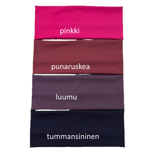 Panta kaksinkertaista joustavaa puuvillatrikoota, pesu 40 astetta. Pannan leveys on noin 9-10cm. Sopii urheiluun ja vapaa-aikaan. One size nuorille ja aikuisille (päänymp.53-58cm)